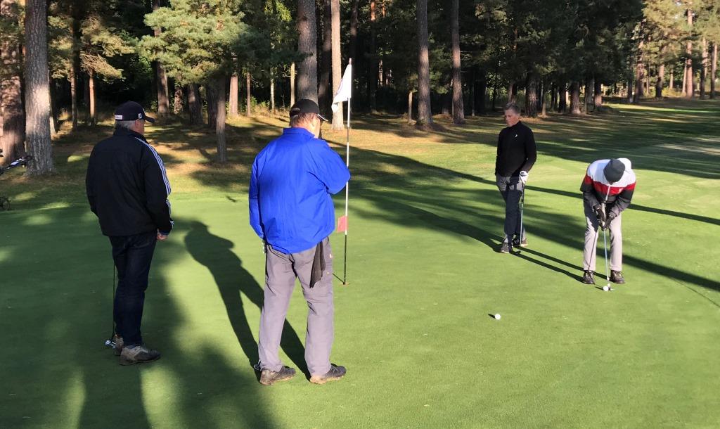Idag sken solen igen. Men den var väl dold när vi började. Mycket mörkt hemma och lite mörkt när vi slog ut från 10:an. Inte alls lika kallt idag som det var förra veckan. Men det verkar som kvaliteten på spelet har avtagit en aning jämfört med tidigare under säsongen, vädret till trots. Vi blev sju stycken som letade sig fram till utslagsplatsen i tid till start. Tävlingsledningen outsourcade lottningen. Det var spelet, eller bristen därpå, som gjorde att den inledande trebollen kom in i mål på 18:e med god marginal till andrabollen. Lite fuktigt och sandigt efter någon form av dressande på fairway.
