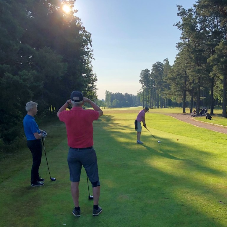 Idag sken solen lite tveksamt mellan molnen och värmen var inte riktigt lika påträngande som förra veckan. Skönt med andra ord även om vissa tvekade med shortsen. Vi var åtta spelare som kommit till start. Eftersom det var gott om folk på banan och vi fick gå ut på 10:an. Tyvärr hamnade vår förstaboll efter en treboll som var lite nybörjaraktiva, slog snett och tog tid på sig. Det hjälpte inte att de hade en femboll framför sig och att vi blev ikappspelade av en snabb välspelande tvåboll. Mycket trafik alltså.