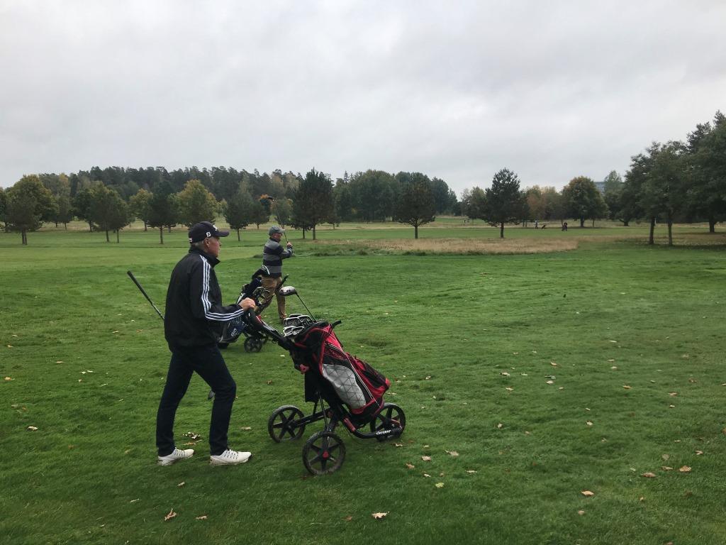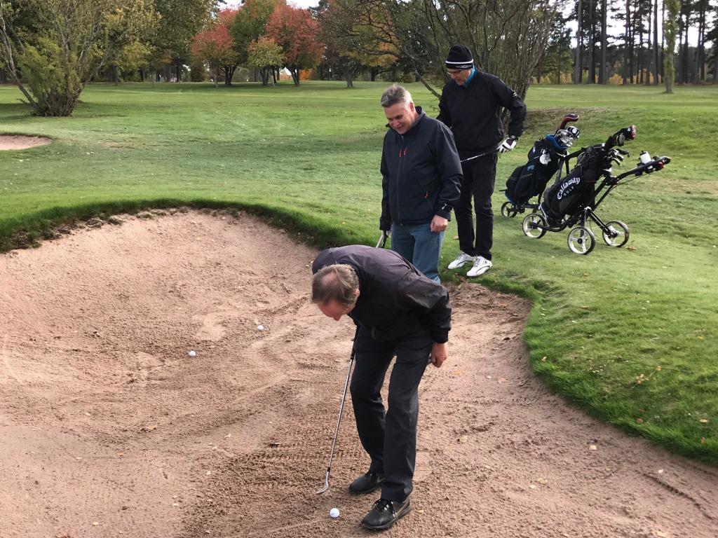 Sista rundan med gänget i år. För en del av oss i alla fall. Även sista rundan för i år kanske? Nu får vi börja se fram emot snön och skidspåren på golfbanan. Det blir tider det! Men i det något gråa höstvädret, som för säsongen var tämligen varmt ändå, var vi efter lite manfall sju spelare som kom till start. Ingen större trängsel på banan och det kändes som om det skulle kunna börja regna när som helst. Nu blev det inget regn under dagen utan vädret bättrade sig efter hand som dagen gick, även om det aldrig blev riktigt bra. Efter nio hål kände Jan II att hans rygg inte skulle hålla för mer varför han tog befälet över bastun och såg till att den var förberedd för övriga i samband med färdigt spel.